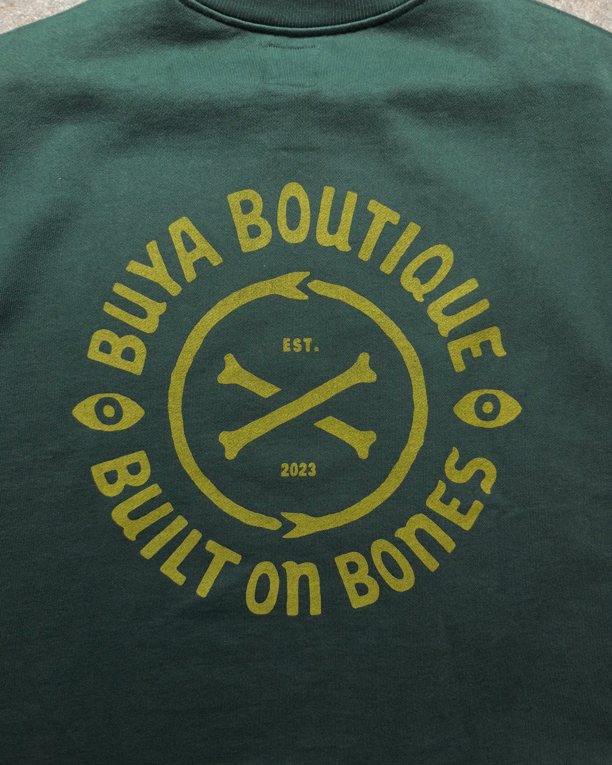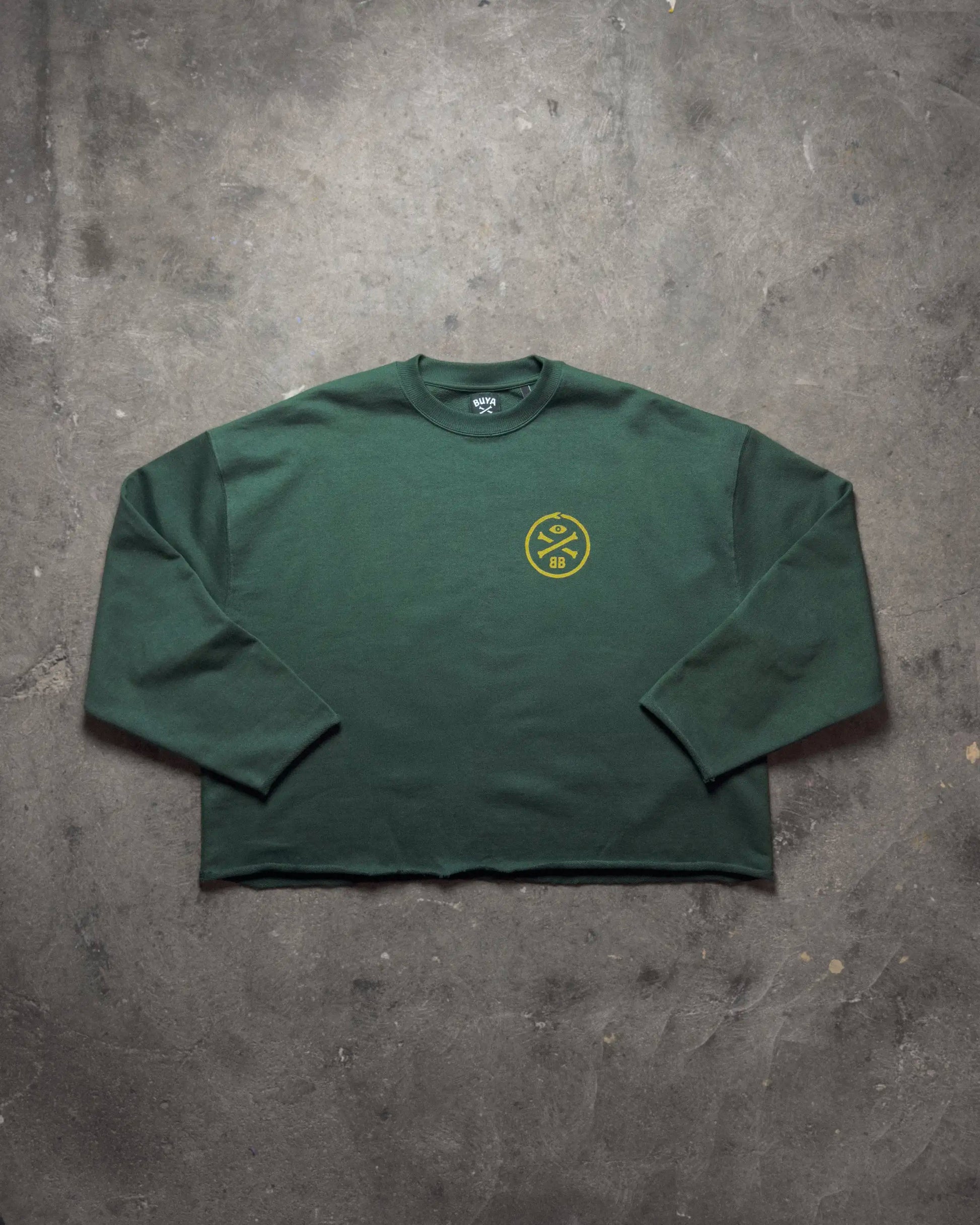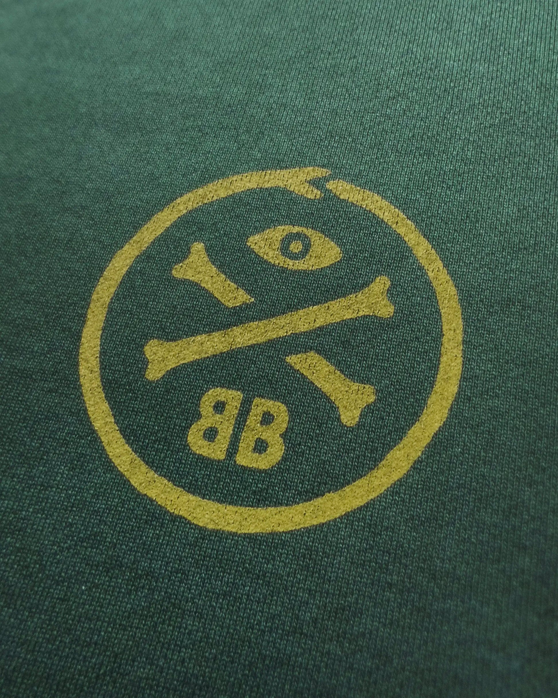 This wild green garment features a mustard yellow screen-printed design on the left side of the chest and the back.