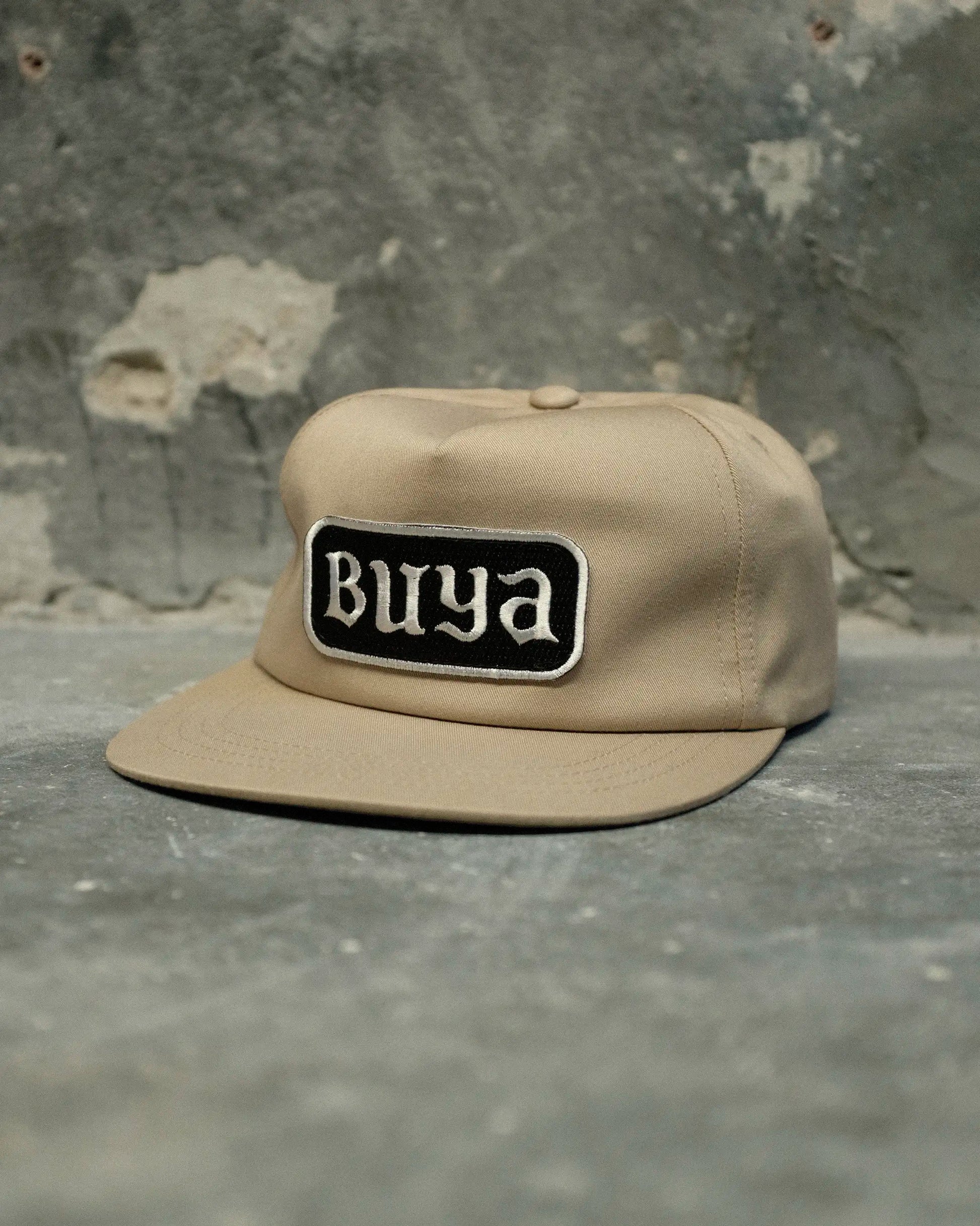 Classic unstructured snap-back cap with an embroidered BUYA patch and rear flag label detail.