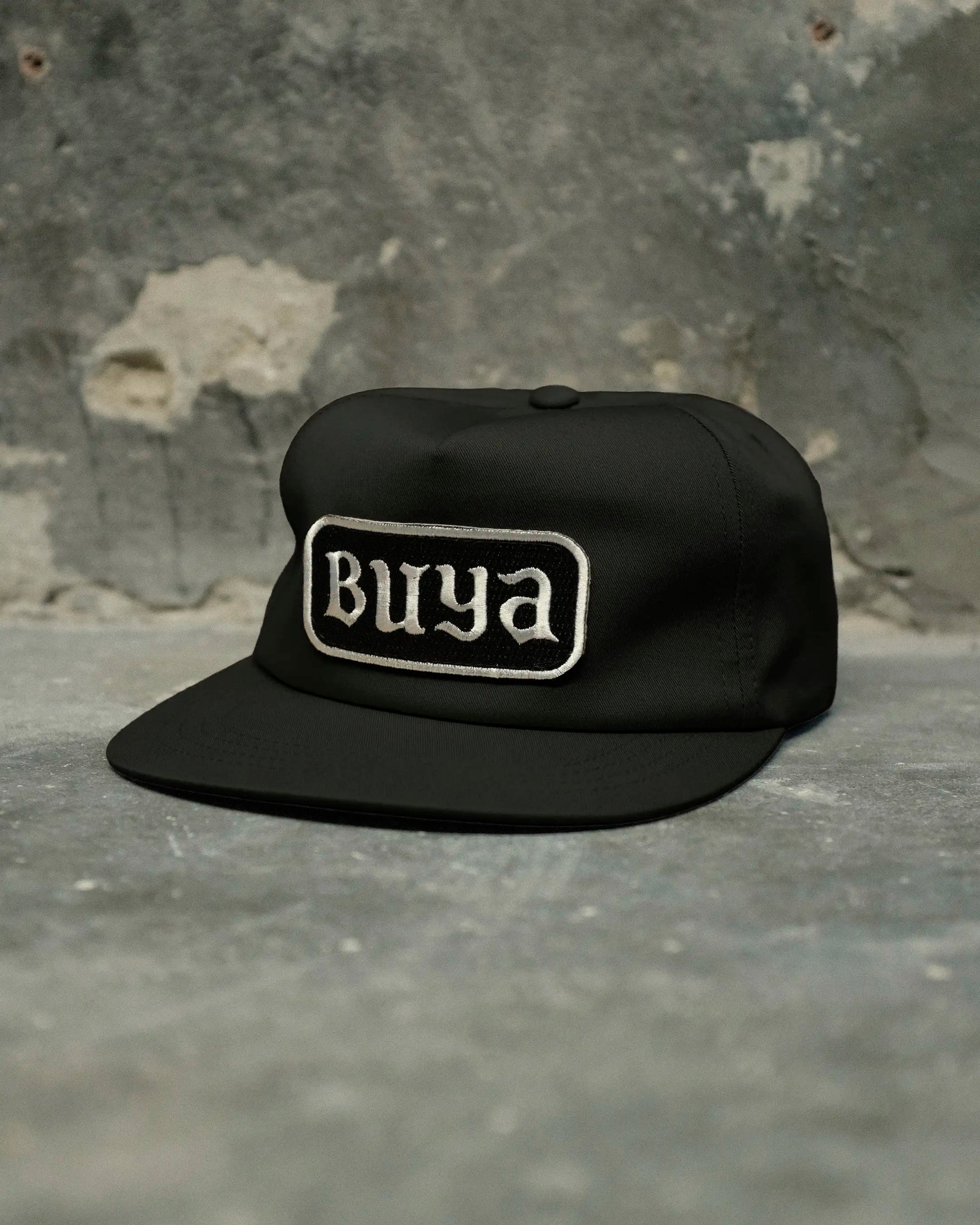 Classic unstructured snap-back cap with an embroidered BUYA patch and rear flag label detail.
